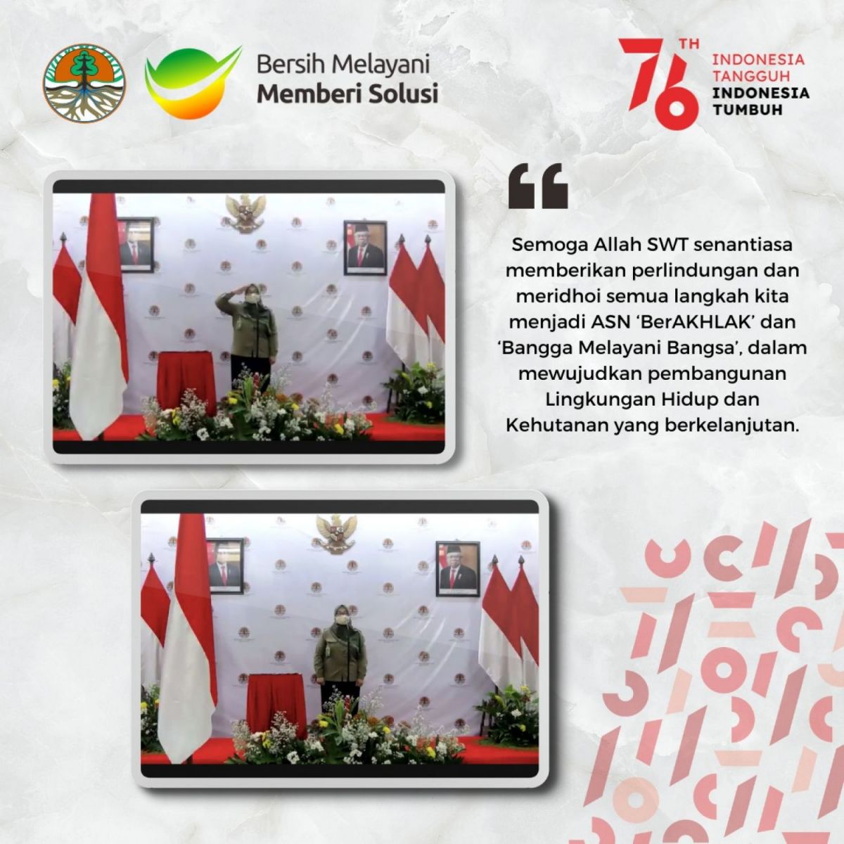 Jakarta, Sebagaimana Surat Menteri Pendayagunaan Aparatur Negara dan Reformasi Birokrasi Republik Indonesia, Nomor: B/75/M.KT.00/2021 tanggal 14 Juni 2021 perihal Himbauan Pelaksanaan Apel Pagi, mulai tanggal 19 Juli 2021 kita akan melaksanakan Apel Pagi setiap minggunya yaitu pada Senin pagi. Tapat hari ini tanggal 2 Agustus 2021 merupakan Apel Pagi yang ketiga lingkup Kementerian Lingkungan Hidup dan Kehutanan (KLHK) yang diikuti oleh seluruh pejabat dan pegawai, baik yang tengah melaksanakan tugas kedinasan dari kantor (work at the office) maupun yang melaksanakan tugas kedinasan dari rumah (work from home) secara virtual.