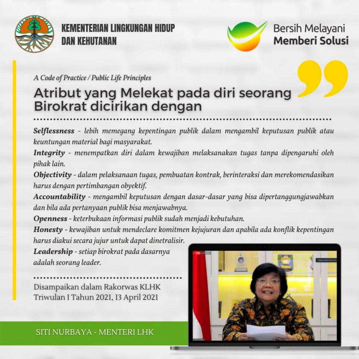 Menteri LHK menyampaikan pada Rakorwas KLHK Triwulan I tahun 2021 sedikitnya ada 7 (tujuh) atribut yang melekat pada diri seorang birokrat.