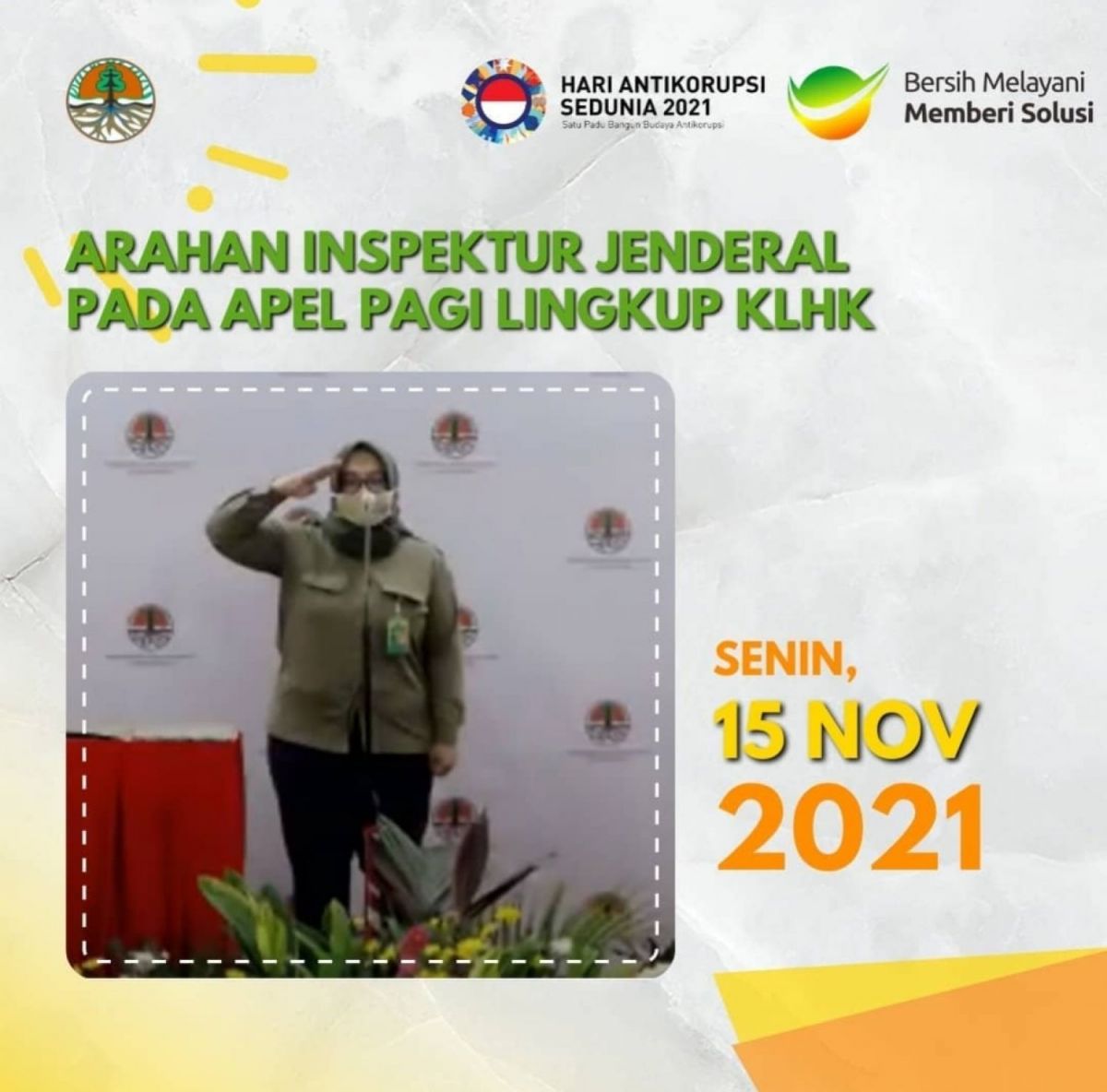 Dalam kesempatan apel pagi lingkup Kementerian LHK yang dilaksanakan secara faktual dan virtual terbatas tanggal 15 November 2021, Inspektur Jenderal KLHK Ibu Laksmi Wijayanti selaku Pembina Apel Pagi menyampaikan bahwa salah satu framework penyelenggaraan dan penilaian SPIP terintegrasi adalah Indeks Efektivitas Pengendalian Korupsi (IEPK). IEPK merupakan sebuah kerangka pengukuran atas kemajuan segala upaya pencegahan dan penanganan risiko korupsi di dalam organisasi. Dimensi IEPK merupakan pengembangan dari Fraud Control Plan (FCP) yang merupakan kerangka pengelolaan risiko korupsi dalam organisasi.