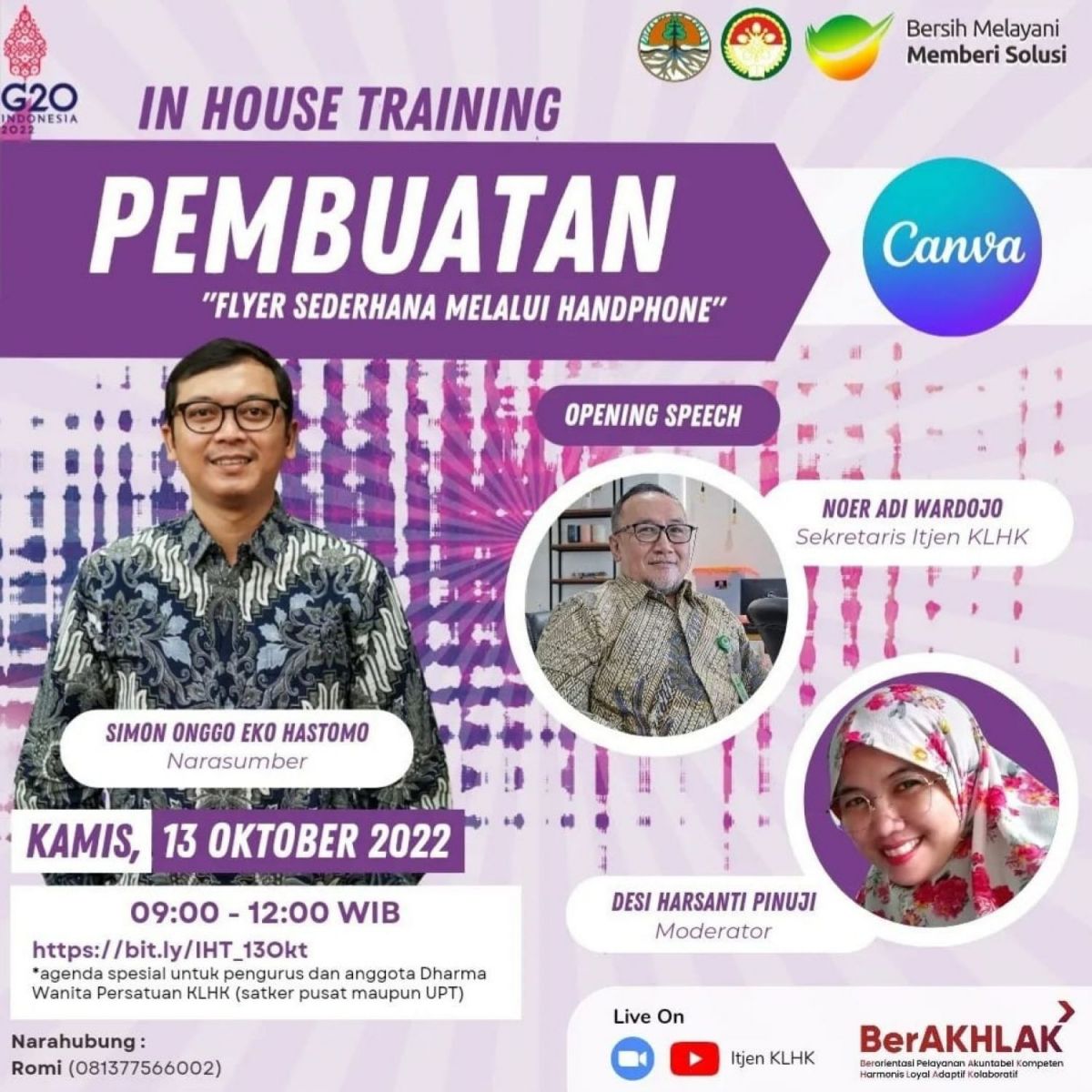 Sebagai bagian program peningkatan kualitas sumber daya anggota keluarga PNS dan demi mencapai kesejahteraan nasional. Itjen KLHK berinisiasi untuk bekerjasama dengan Dharma Wanita Persatuan Itjen KLHK menyelenggarakan "In House Training Pembuatan Flyer." Sebagaimana kita ketahui flyer di era saat ini merupkan sarana promosi media yang efektif.
