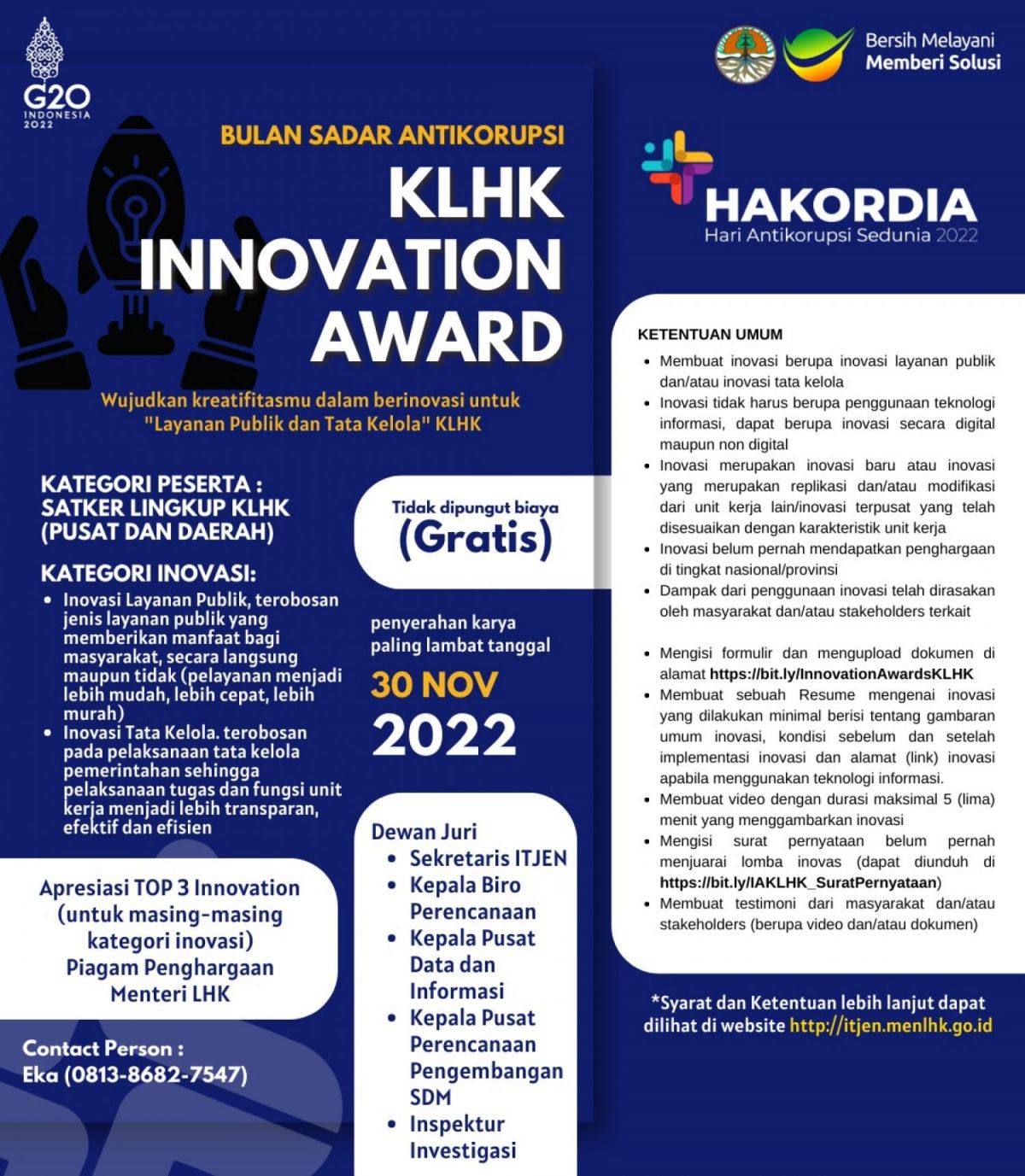 Inspektorat Jenderal Kementerian Lingkungan Hidup dan Kehutanan Republik Indonesia mengadakan KLHK INNOVATION AWARD. Wujudkan kreatifitasmu dalam berinovasi untuk "Layanan Publik dan Tata Kelola" KLHK.
