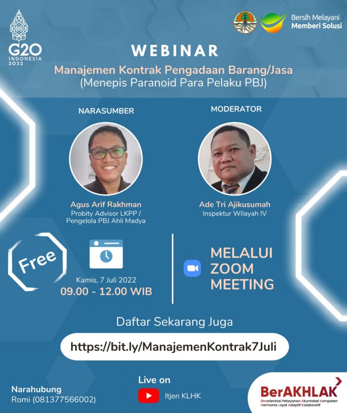 Dalam rangka memberikan pengetahuan dan pemahaman tentang prinsip dasar manajemen pelaksanaan kontrak barang dan jasa pemerintah termasuk komitmen penggunaan Peningkatan Produksi Dalam Negeri (P3DN) dan kebijakan e-katalog sektoral, Inspektorat Jenderal akan menyelenggarakan webinar dengan tema "Manajemen Kontrak PBJ (Menepis Paranoid Para Pelaku PBJ).