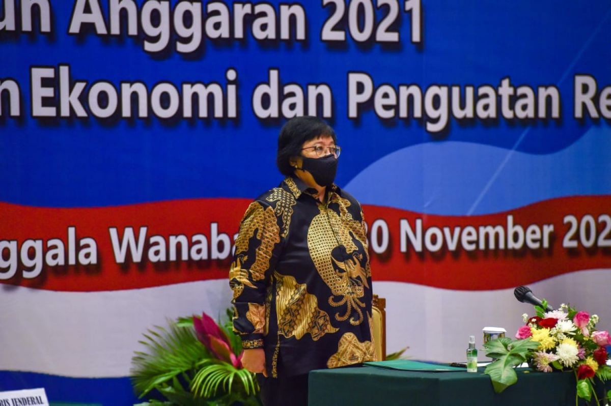 Menteri Siti mengingatkan bahwa dalam kondisi pandemi Covid-19, pemerintah melalui Kementerian LHK diharapkan memberikan kontribusi nyata terhadap masyarakat di sekitar Kawasan hutan melalui Program Pemulihan Ekonomi Nasional (PEN). Target kegiatan PEN KLHK berupa padat karya dalam rangka penanaman mangrove seluas 15.000 Ha dan dan ketahanan pangan terpadu (food estate) dengan anggaran ± 800M selama 3 bulan.