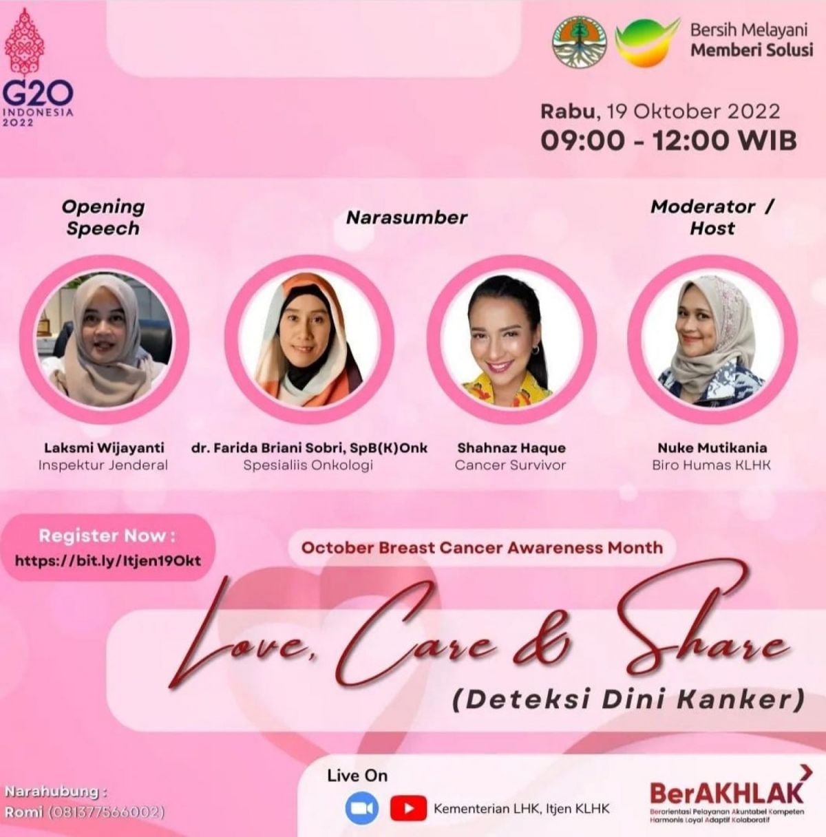 Dalam rangka memperingati Breast Cancer Awareness Month 2022, itjen KLHK bersama dengan Sub Pokja PUG Itjen KLHK dan DWP UP Itjen KLHK mengadakan webinar series dengan tema "Love, Care dan Share" (Deteksi Dini Kanker) yang akan dilaksanakan pada :