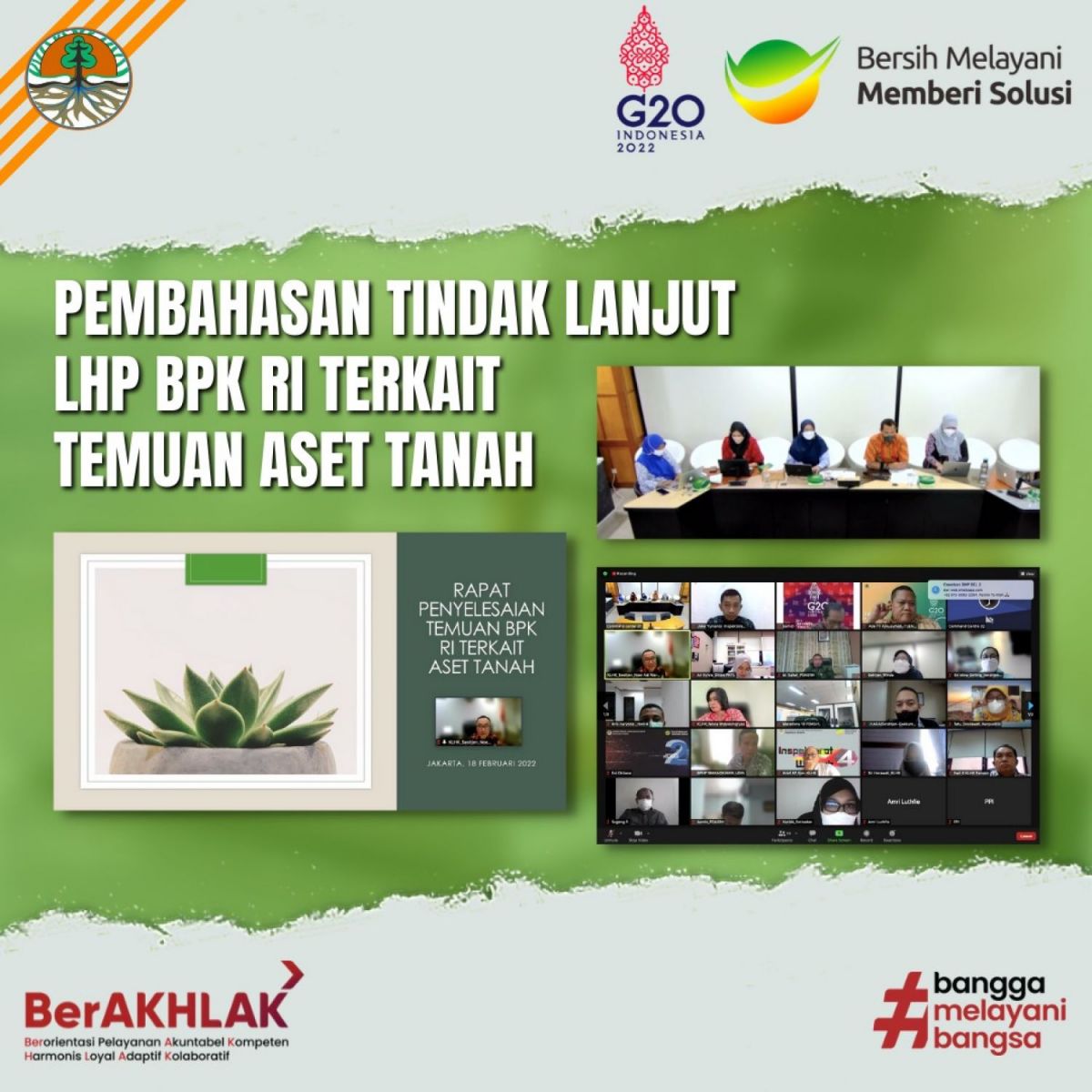 Sebagai salah satu komitmen serius untuk mewujudkan tata kelola BMN KLHK yang lebih akuntabel serta sekaligus sebagai langkah nyata percepatan Tindak Lanjut Hasil Pemeriksaan BPK-RI, pada hari Jumat tanggal 18 Februari 2022 dilaksanakan rapat pembahasan penatausahaan aset tanah yang dipimpin oleh Sekitjen dan dihadiri oleh kepala biro umum serta Sekretaris Badan/Sekretaris Ditjen.