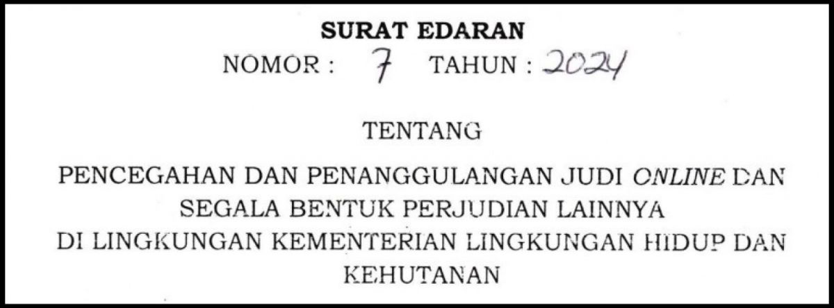 Merespons maraknya kasus perjudian online, termasuk judi slot, Kementerian Lingkungan Hidup dan Kehutanan (KLHK) mempertegas komitmennya dalam mencegah segala bentuk perjudian di lingkungan kementerian. Langkah ini sejalan dengan Undang-Undang Nomor 11 Tahun 2008 tentang Informasi dan Transaksi Elektronik, sebagaimana telah diubah oleh Undang-Undang Nomor 1 Tahun 2024, serta Instruksi Menteri Komunikasi dan Informatika Nomor 1 Tahun 2023 tentang pemberantasan judi online.