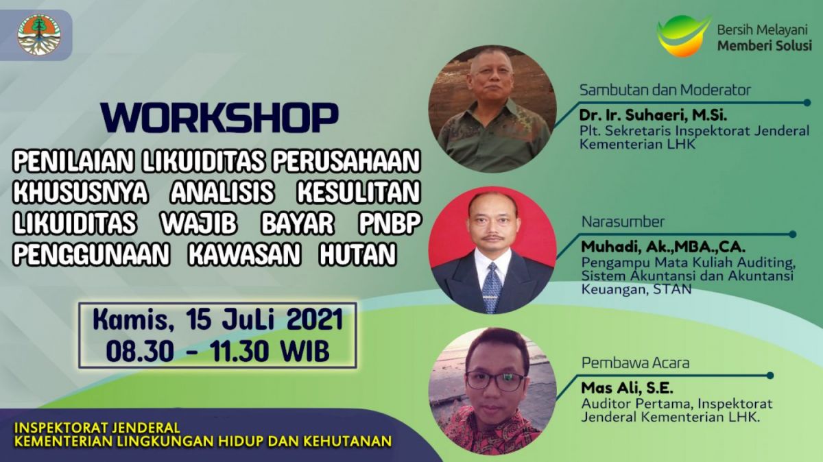 Dalam rangka menindaklanjuti Instruksi Menteri tersebut antara lain dengan melakukan workshop dengan Tema Penilaian Likuiditas Perusahaan, khususnya Analisis Kesulitan Likuiditas Wajib Bayar PNBP Penggunaan Kawasan Hutan yang dilaksanakan pada hari Kamis (15/07/2021), dilakukan melalui daring dan diikuti oleh seluruh auditor Inspektorat Jenderal KLHK. Workshop tersebut dibuka oleh Dr. Ir. Suhaeri, M.Si (Plt. Sekitjen KLHK) dengan Narasumber Muhadi, Ak., MBA, CA yang merupakan pengampu mata kuliah auditing, sistem akuntansi dan akuntansi keuangan, Politeknik Keuangan Negara STAN.