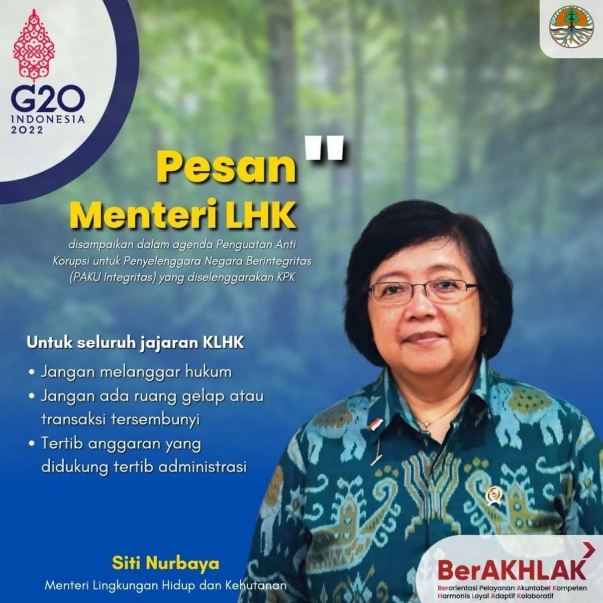 Menteri LHK menekankan tiga hal kepada seluruh jajaran KLHK, yaitu jangan melanggar hukum, jangan ada ruang gelap atau transaksi tersembunyi, dan juga terus mengarahkan agar tertib anggaran yang didukung tertib administrasi.