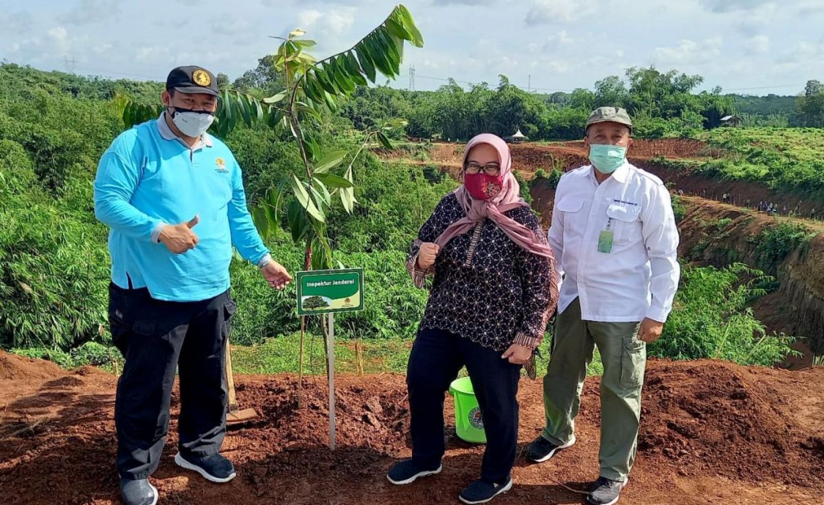 Inspektur Jenderal Laksmi Wijayanti dan Sekrearis Inspektorat Jenderl Murdiyono beserta Pejabat Pimpinan Tinggi lingkup Kementerian LHK mendampingi Menteri Lingkungan Hidup dan Kehutanan (LHK), Siti Nurbaya bersama Wakil Menteri (Wamen) LHK, Alue Dohong, melakukan penanaman pohon di lokasi pembangunan Pusat Persemaian Modern Rumpin, Bogor (13/3/2021). Penanaman ini dilakukan dalam rangkaian peringatan Hari Bakti Rimbawan ke-38 pada tahun 2021.